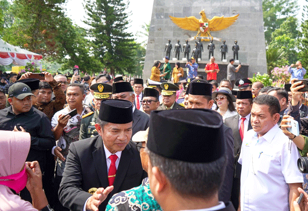 Usai melaksanakan Upacara Pj. Gubsu Dr Hassanudin didampingi Wakil Bupati Simalungun, H.Zonny Waldi, Forkopimda Provsu dan pejabat lainnya melakukan peletakan karangan bunga di Monumen Tugu Letda Sujono. (Rulim)